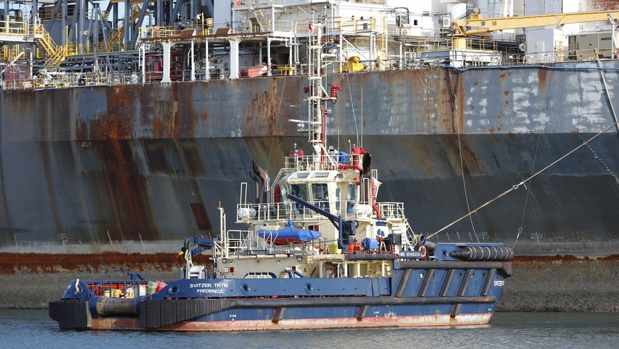 Der var travlhed i havnebassinet ved M.A.R.S. Europe i Frederikshavn i går, hvor flere slæbebåde flyttede skibet Zafiro Producer.
