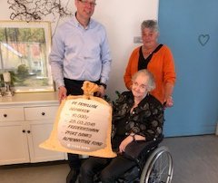 Jyske Banks Almennyttige Fond har netop givet et tilskud på 10.000 kroer til busprojektet. På et billede under artiklen ses afdelingsdirektør i Jyske Bank Frederikshavn, Henrik Christensen, sammen med beboer Poula Kjær og sosu-assistent Marianne Mikkelsen.