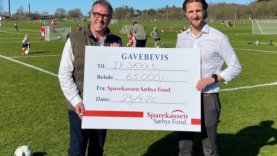 I den forgangne uge strålede solen lidt ekstra over fodboldklubben på Kjeldgaardsvej. Det skete, da lokalbankchef Lasse Kjærsgaard Stidsborg kunne overrække en check af de lidt større til formand for IF Skjold Sæby, Flemming Thingbak.