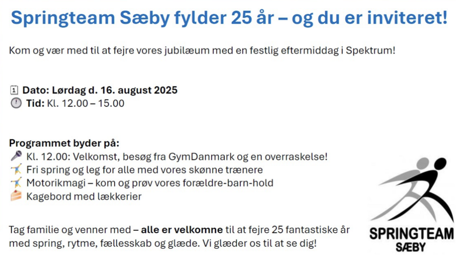 Den 16. august kl. 12-15 inviterer Springteam Sæby til jubilæumsfejring i Spektrum, hvor foreningen markerer 25 år med spring, rytme, fællesskab, glæde og flotte resultater.