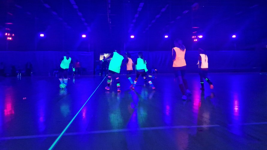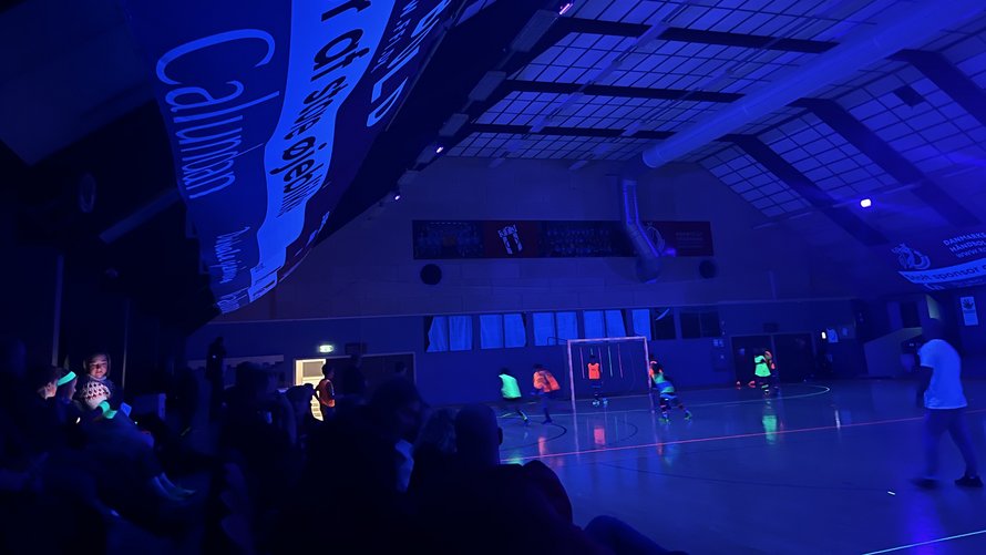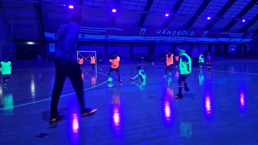 Det ultraviolette lys lyser ikke blot banens streger, mål og net op, men også de mange spillere, som har valgt at deltage.