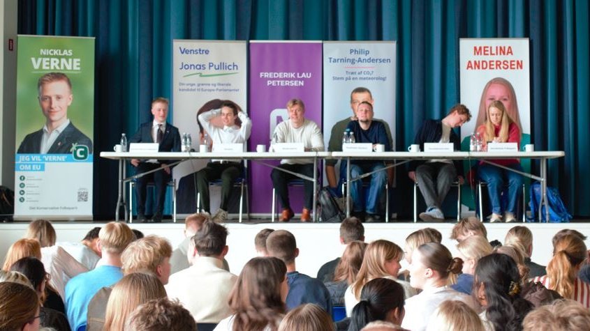 Langt de fleste elever på de sidste årgange på Frederikshavn Gymnasium og HF troppede op i festsalen mandag lige efter frokost, da Europabevægelsens demokratikaravane lagde vejen forbi. Og efter spørgsmålene fra salen at dømme er interessen for EU og valget til Europa-Parlamentet stor blandt unge i Frederikshavn.