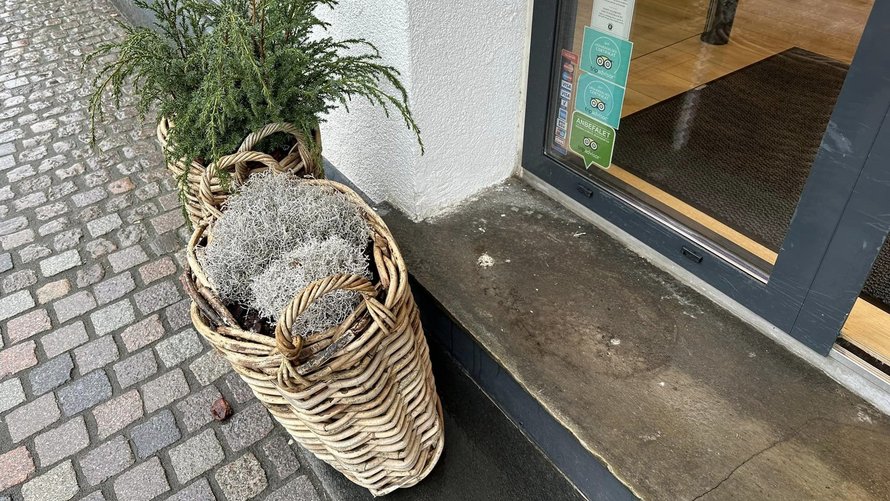 Restaurant Smørgåsen har i alt fire kurve stående ved indgangen. Alle fire er boltet fast. Til det formål er der placeret en træplade i bunden af kurvene.