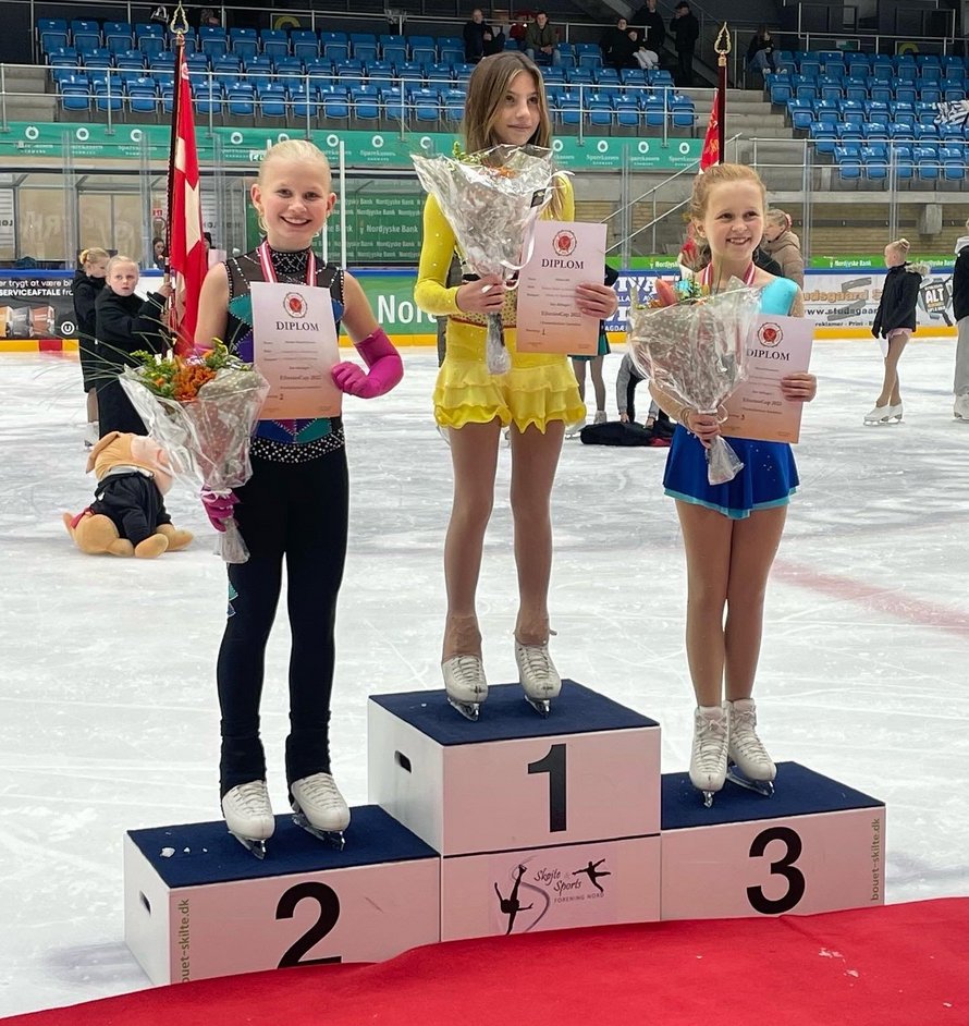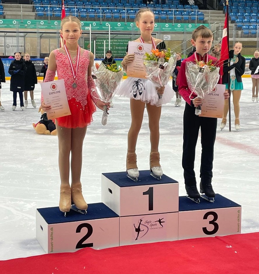 I samme række sejrede 12-årige Freja Kirkelund. Freja lykkedes særligt med to svære piruetter på level 2, og hun havde også to Axler med, der dog drillede lidt i landingen, men pointene var høje nok til, at hun kunne få hængt guldmedaljen om halsen.