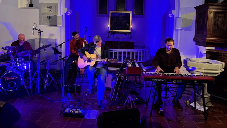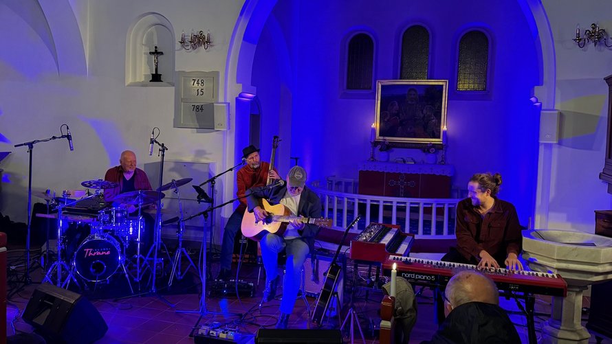 Musikerne var badet i smukt, blåt lys, som skabte en stemningsfuld og næsten intim atmosfære i kirkerummet – en lyssætning, der passede perfekt til netop bluesgenren og understregede musikkens sjælfulde udtryk.