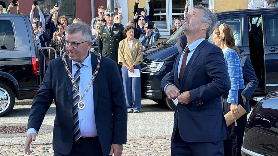 Kongeparret blev modtaget af borgmester Karsten Thomsen og 1. viceborgmester Peter E. Nielsen, hvorefter de hilste på byrådet